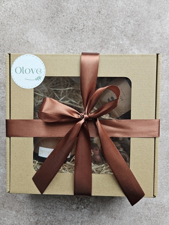 Całość zapakowana jest w estetyczne kartonowe pudełko z okienkiem, przewiązane ozdobną wstążką – gotowe do wręczenia bez dodatkowego pakowania.
